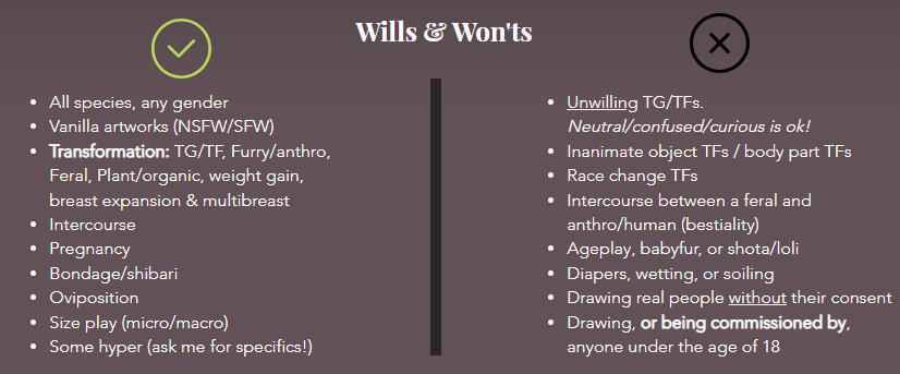 A: For a brief overview, it would be: Character appearance/ref sheet, their feelings towards the TF (unwilling/willing?), what they transform into, and if there's any specific body parts of the TF you'd like me to really focus on.Q: Can you do ALT versions of my commission?